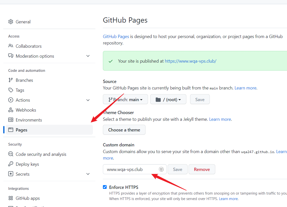 当GitHub检测到是能用的以后,我们点击Save,点击Enforce HTTPS