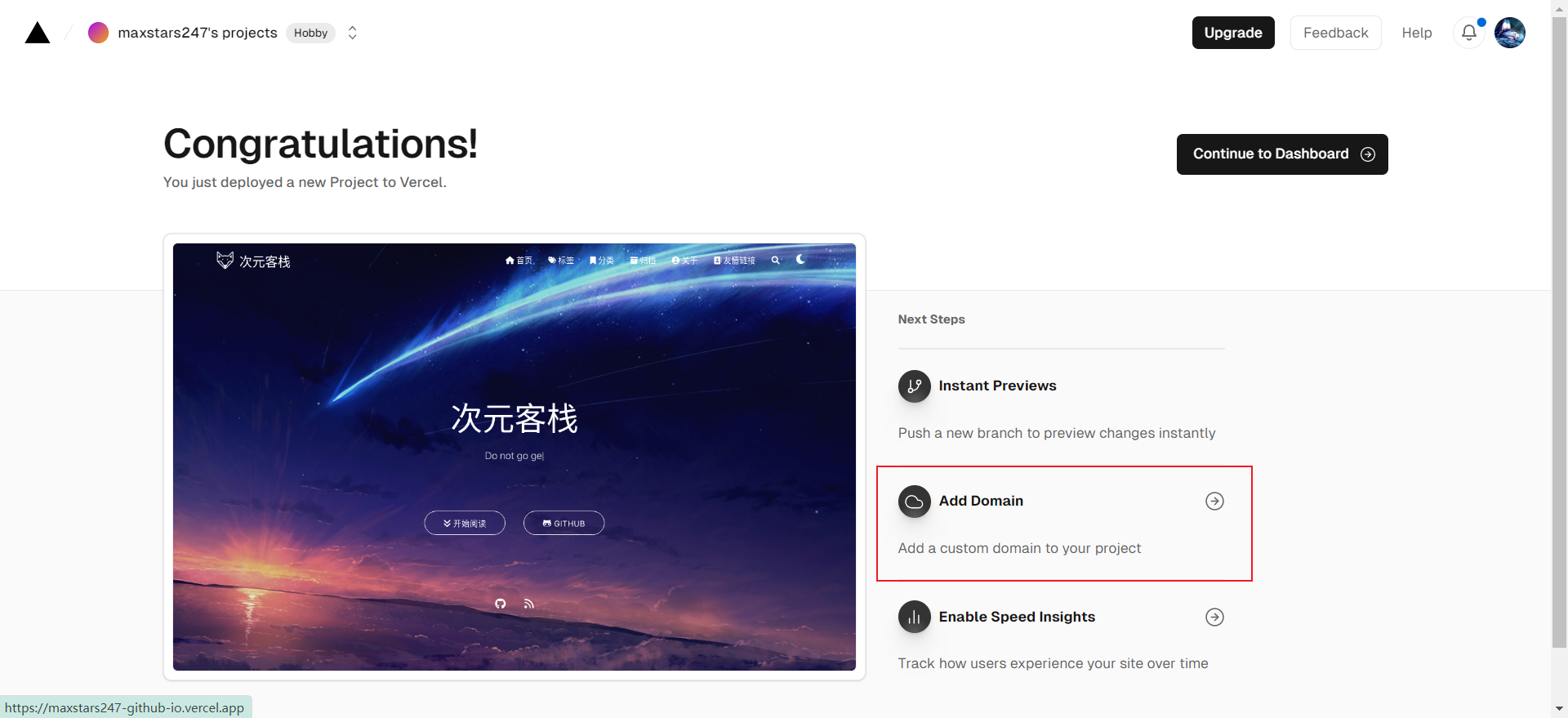 我这里的建议是,使用vercel分配的域名进行加速,使用另外一个域名做备用访问接口,因此,你可能需要两个域名来完成这个项目: