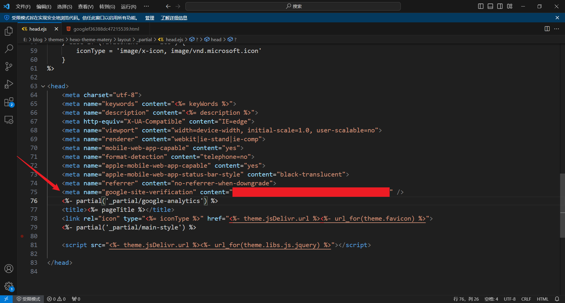 复这串HTML标签,来到hexo-theme-matery/layout/_partial/head.ejs中添加HTML标签: