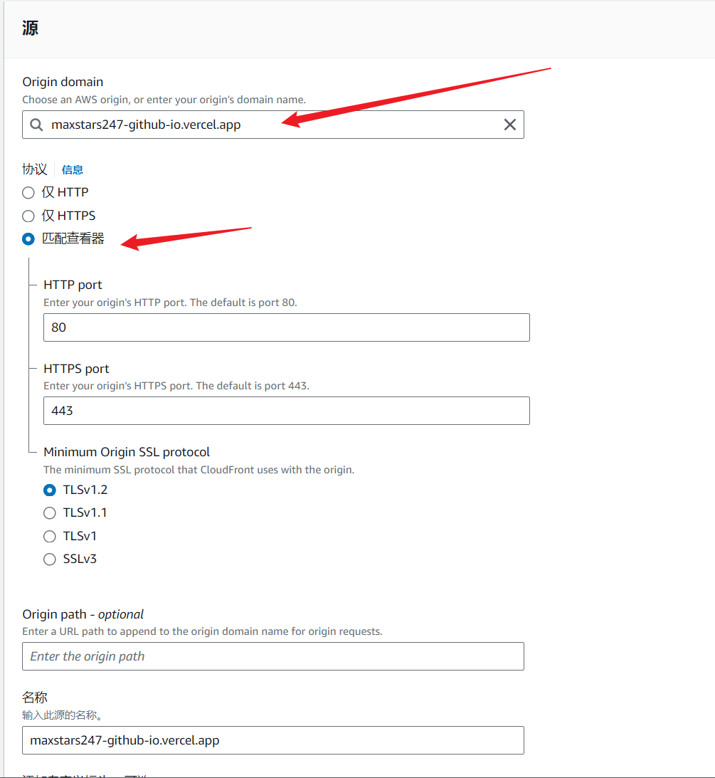 将vercel分配给博客的域名填入Origin domain(源域),设置协议为匹配查看器: