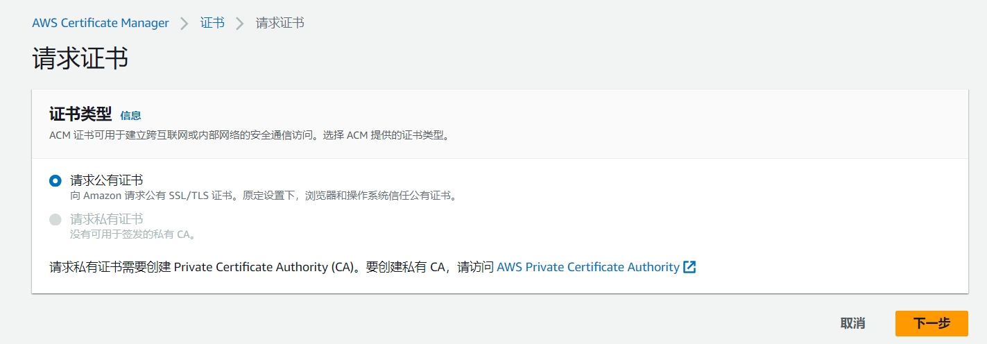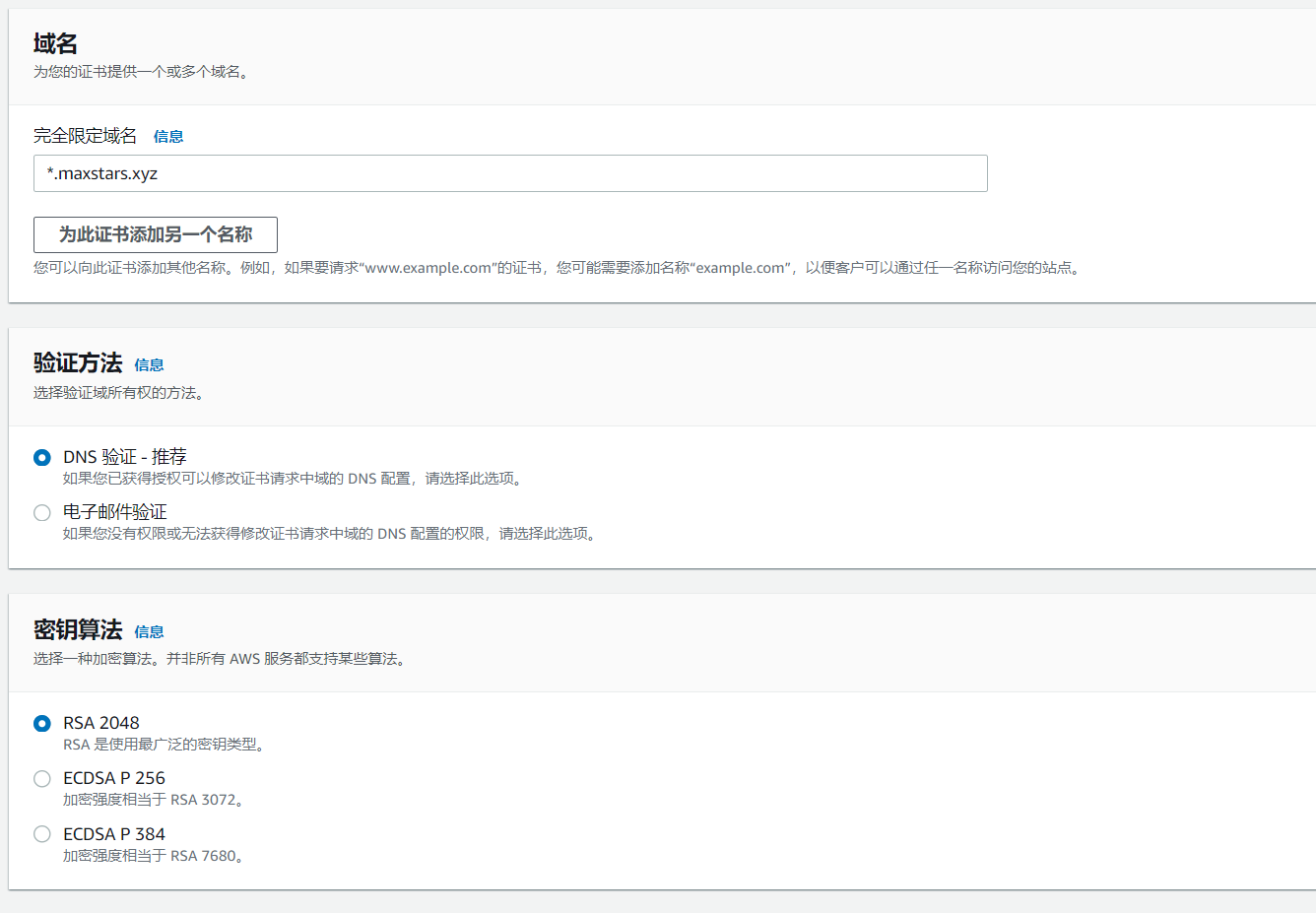 这里填写*.你的域名,例如*.maxstars.xyz。然后选择DNS验证。填写完毕后点击请求: