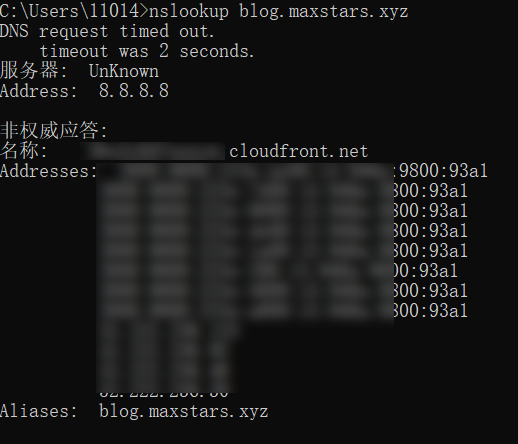等待域名生效后用nslookup查看域名是否已经加速,若查找到xxx.cloudfront.net则已经成功: