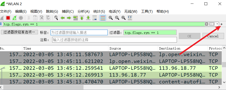 tcp.flag.syn == 1:只抓开始同步会话请求的包