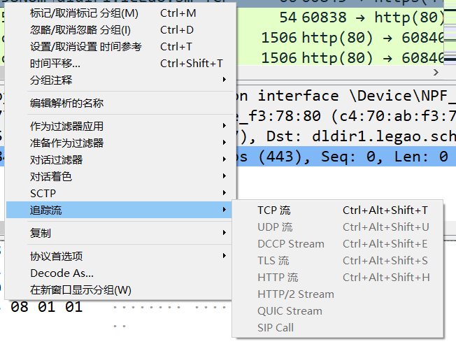 操作:在数据列表右键TCP协议包选择追踪流,选择TCP即可追踪TCP流。在分析选项中也可以选择追踪流