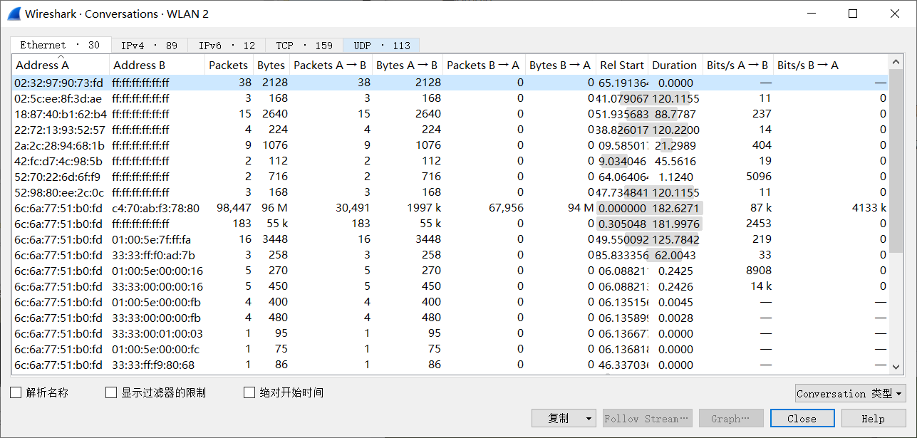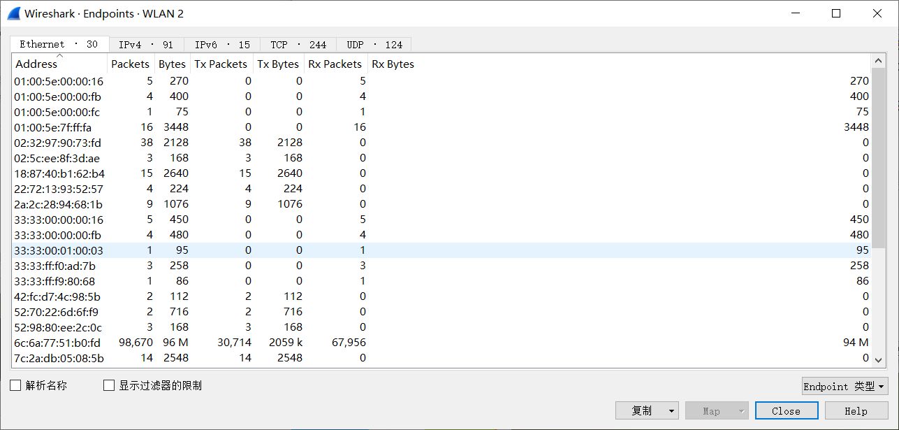 功能:统计通信会话中每个节点接收和发送的数据包和字节数
