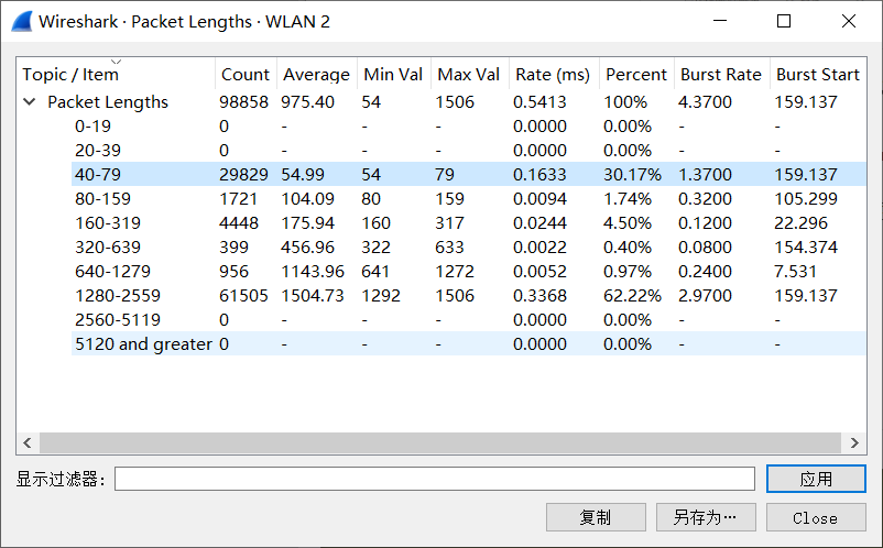 功能:统计数据流量中包长度的分布,检测巨型帧(帧长大于1522字节的以太网帧)攻击,碎片化数据攻击