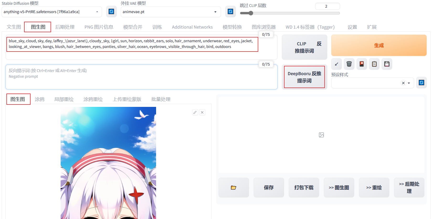 使用WebUI图生图中自带的DeepDanbooru,注意不要使用CLIP,整合包上似乎没有这个插件