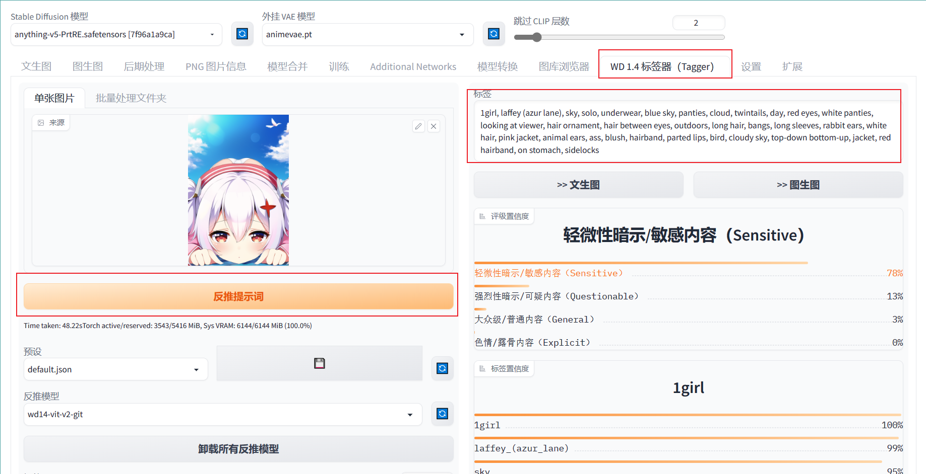 整合包的SD默认自带Tagger,选择即可进入进行反推,运行速度较慢但是结果会比WebUI的DeepDanbooru准确