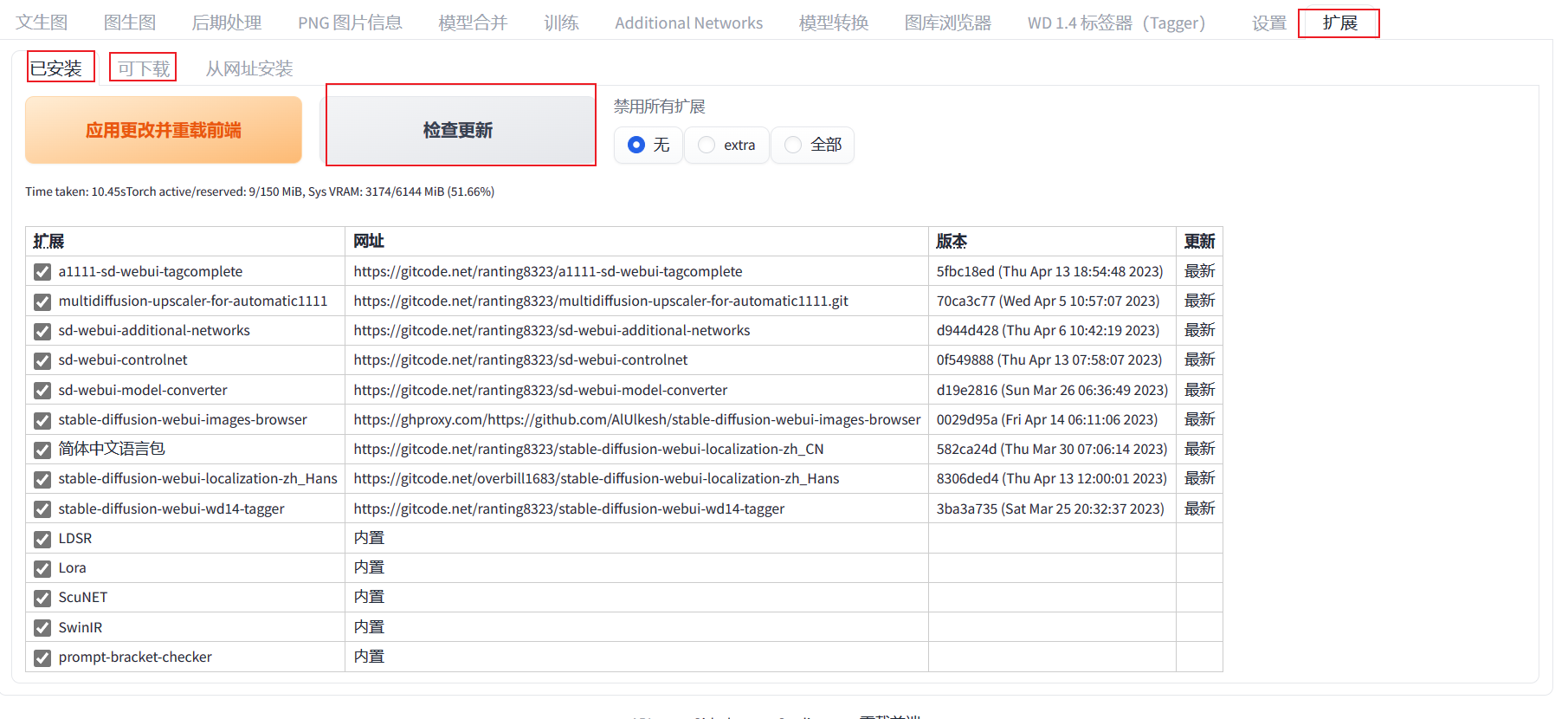 操作:你只需要打开WebUI找到扩展,扩展中即可管理所有插件。你可以检查插件的更新,在可下载列表中安装新的插件