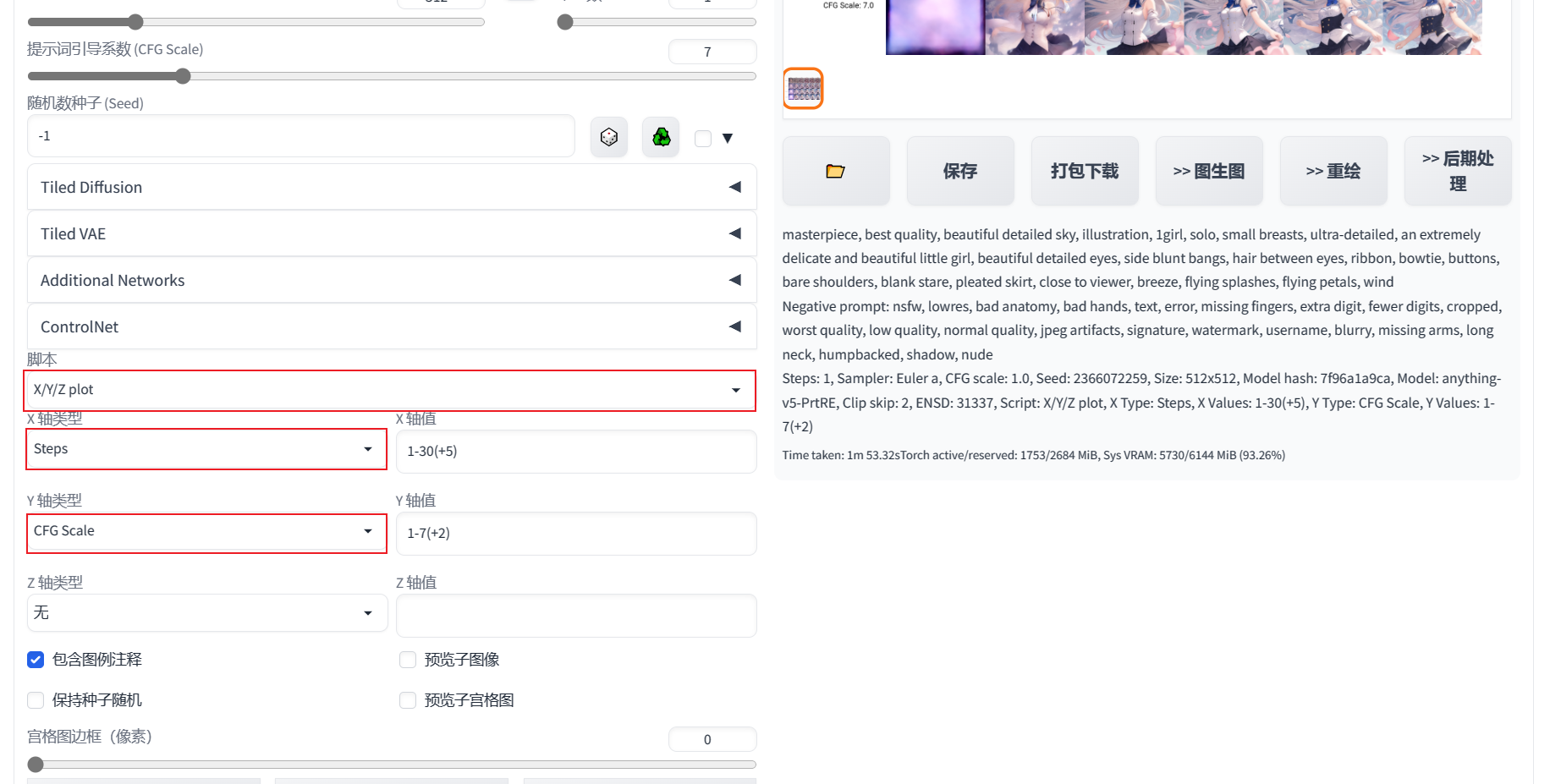 使用SD中的脚本选项找到X/Y/Z plot,可以选择X,X/Y,X/Y/Z,3种