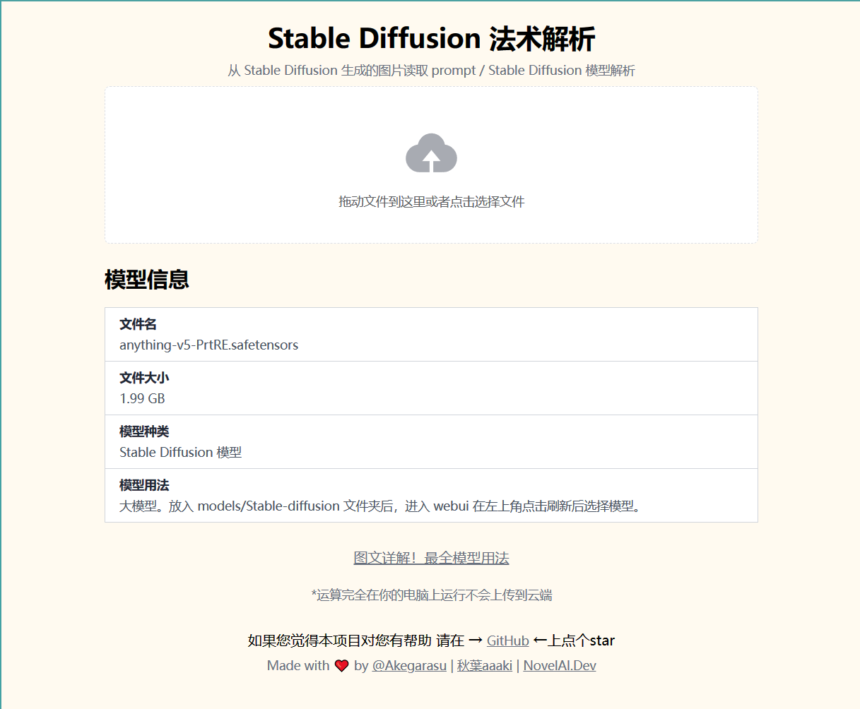 你可以把里面默认包含的anything-v5-PrtRE.safetensors上传识别网站来验证一下,不出意外它应该会提示你为stable diffusion模型。如下图所示: