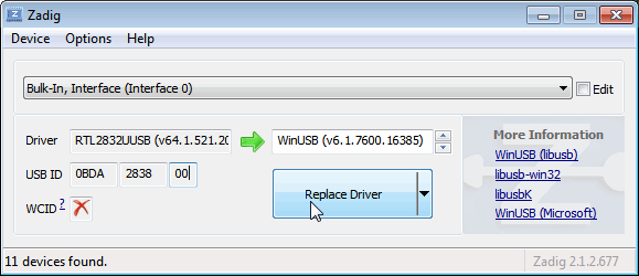 在下拉菜单中选择Bulk-In, Interface(Interface 0),注意在有些计算机中你将会看到名如RTL2832UHIDIR或RTL2832U的设备取代了Bulk-In, Interface的位置,出现这种情况的时候,选这个也可以。不要选择USB Receiver (Interface 0)或者 Interface 1或者这之外的任何选项,不然你会把不该覆写的驱动覆写掉!
