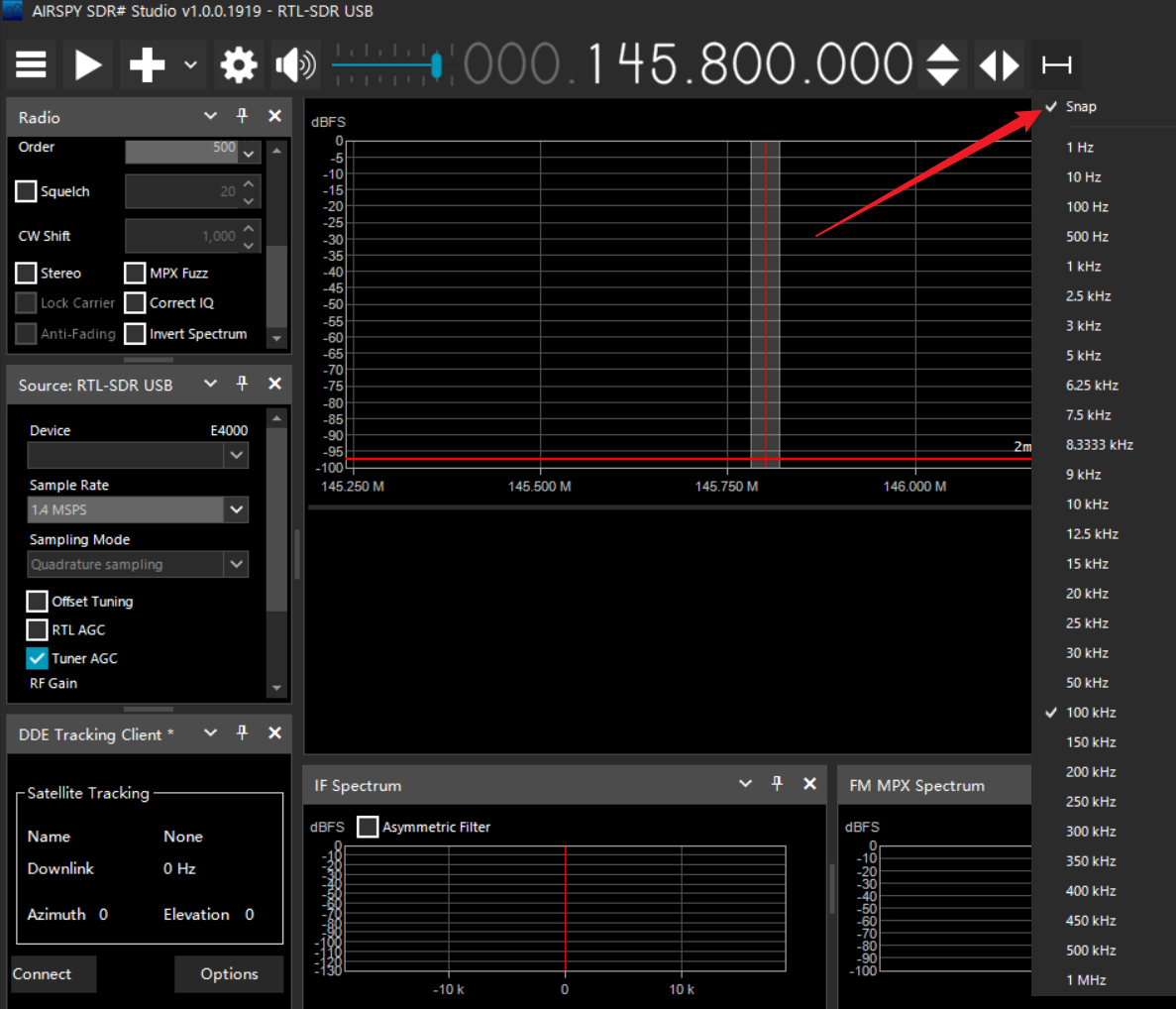 Snap to Grid/Step size(对齐到网络,步进大小):可以设置步进频率,取消对齐即可自由设置频率。老版本的RTL-SDR会因为过热导致频率偏移,所以一般不使用步进频率来手动对齐频偏