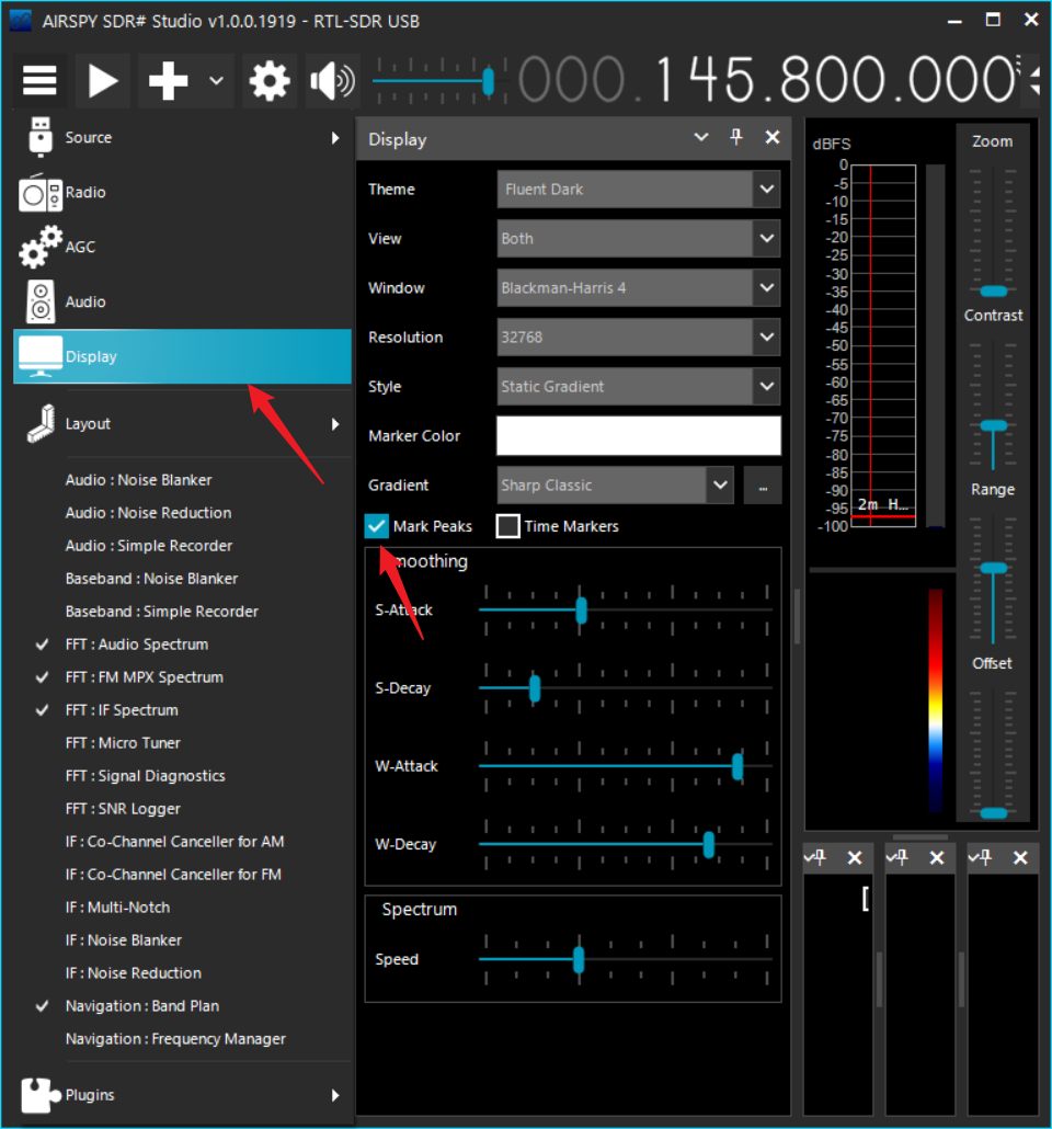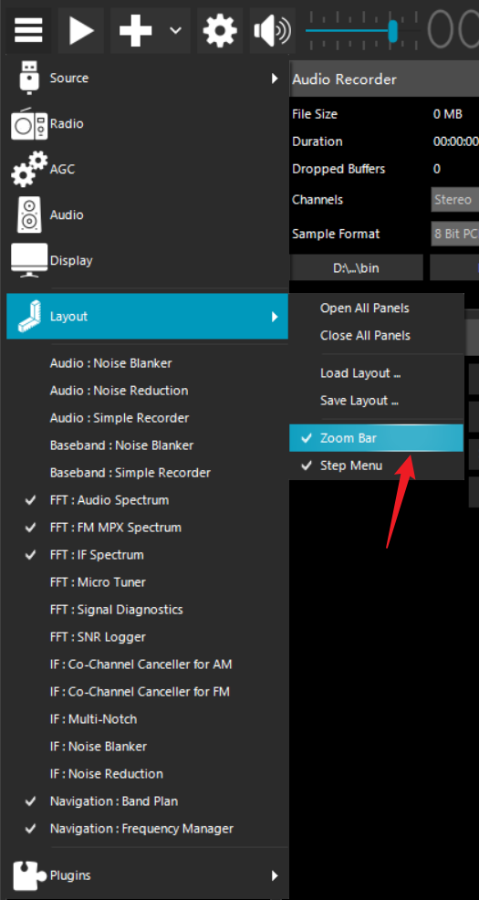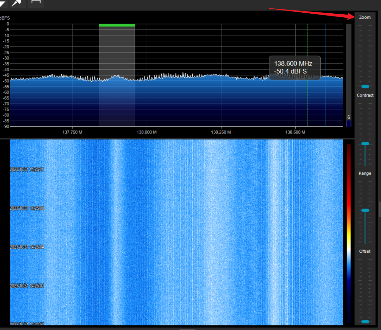 简介:右侧的滑块调整了RF频谱和瀑布流的图形显示设置,你可以在lay out中选中Zoom Bar显示它: