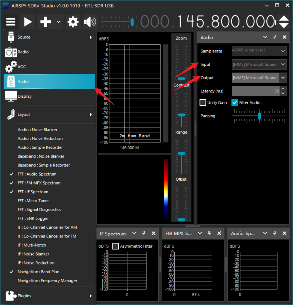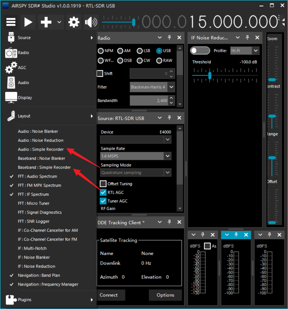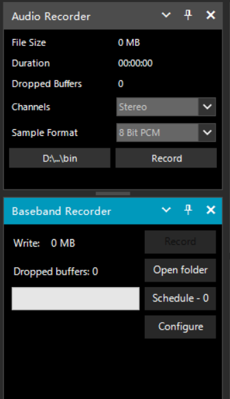 通过勾选“音频”复选框可以录制从扬声器发出的音频。这将记录音频到一个标准的音频。.wav文件。所有记录的文件都存储在与SDR#可执行文件相同的文件夹中。
