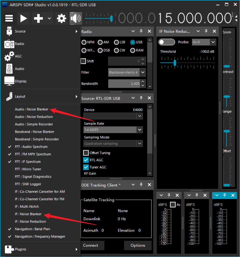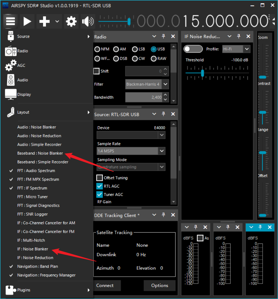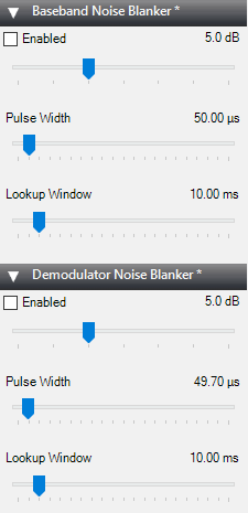 在SDR#中有两种不同类型的噪声消除器。基带噪声消除器在整个频谱上工作,将从 FFT 和瀑布中去除脉冲,而解调器噪声消除器只在目前正在解调的调谐区域内工作。调优设置主要是试验中的一个练习错误。移动滑块,直到脉动噪音消失,同时试图保持信号活跃。