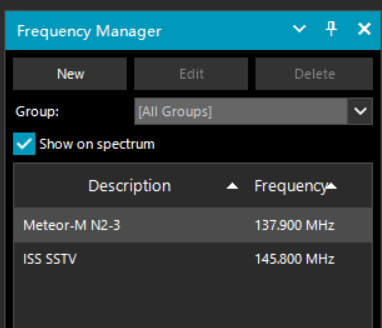 简介:Frequency Manager Tab(频率管理器)允许您将感兴趣的任何频率保存到数据库中。通过单击New按钮,可以向数据库添加新的频率。这将添加一个具有当前频率和设置(如带宽)的记录。你可以编辑记录的名称,并将其放入一个组,以便于管理。双击存储条目将立即调整SDR#到该频率,并设置到存储的模式和带宽。