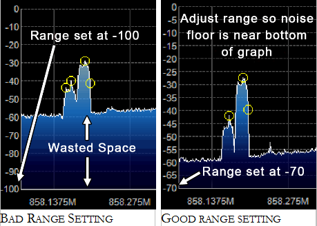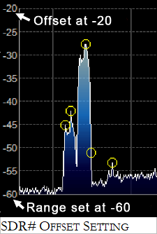 Offset:在RF(射频)频谱窗口中向dB电平区间添加偏移量。偏移量将被添加到RF(射频)频谱中dB电平范围的最高值。通常没有必要调整这个参数,但如果你想真正得到对比度良好的微弱信号,按照信号区间调整垂直轴,使垂直轴的高度与信号高度相同。这种设置也会影响瀑布流中的对比度,并可能有助于使微弱的信号更容易发现。