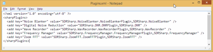 要安装插件,您通常需要复制一个.dll文件添加到SDR#目录,并向Plugins.xml文本文件添加一个magic line文本条目,该文本文件可以在SDR#目录中找到。您需要在记事本或其他文本编辑器中打开此文件才能读取它。插件zip文件中通常包含的自述文件通常会告诉您magic line是什么。应该在 < sharPlugins > </sharPlugins > 标记之间添加这一行。