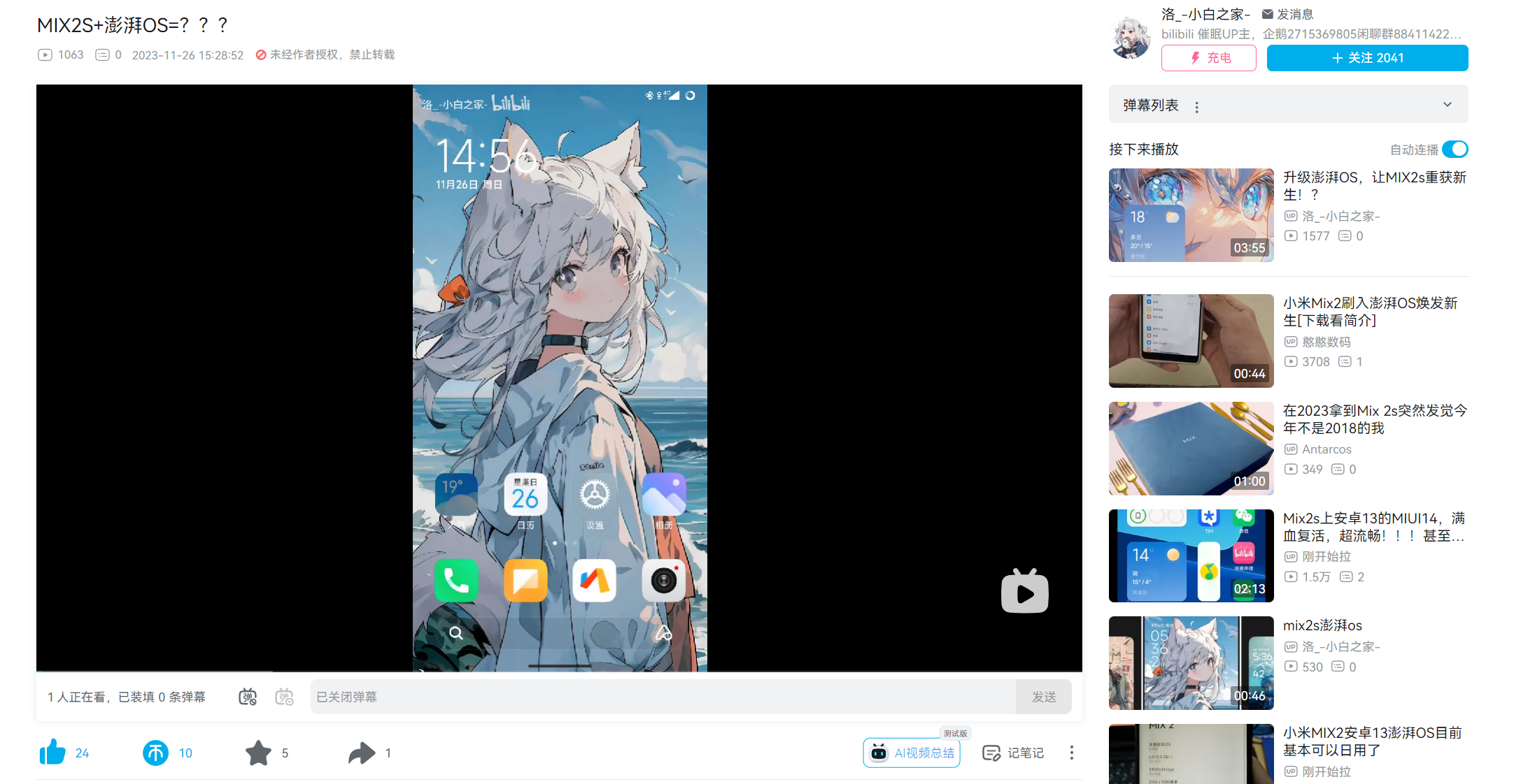 好啊,于是我去b站一搜MIX2S澎湃OS,马上来了展示: