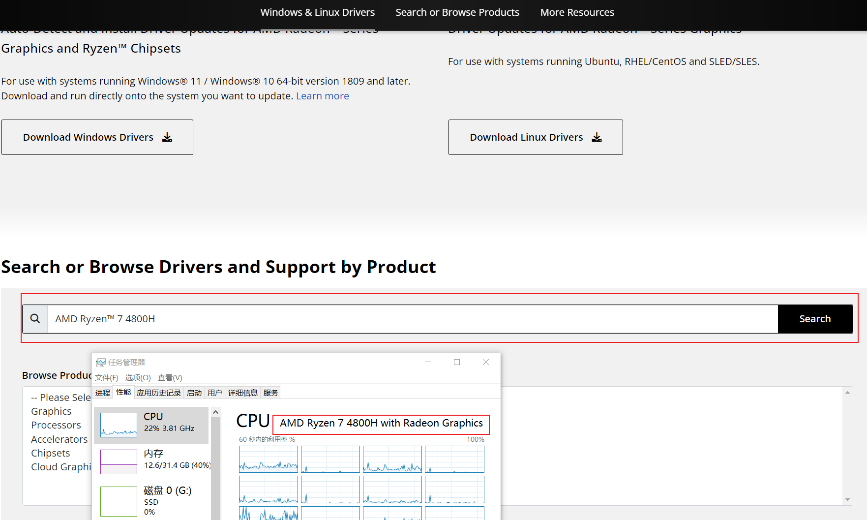 在官网上找到你的显卡型号:例如我的是Ryzen™ 7 4800H,输入到搜索框,点击Search
