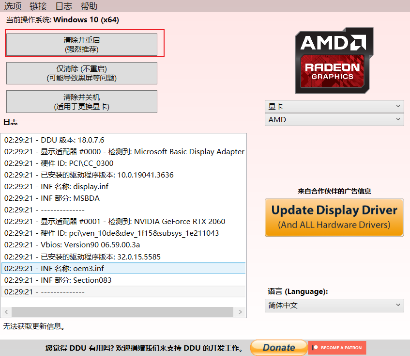 此时选择清除并重启即可。重启完成后,日志应该会检测不到AMD显卡,这时就已经完成驱动的卸载了