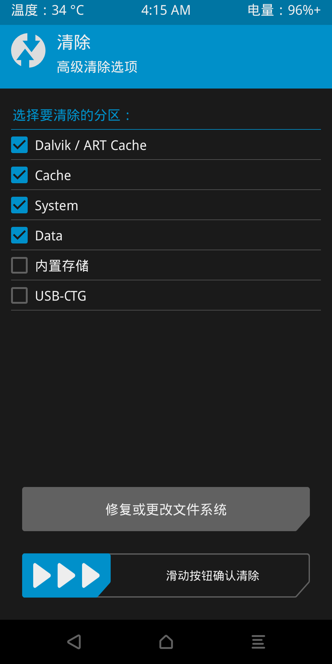 选择高级清除,勾选Dalvik, Cache, System, Data,并清除: