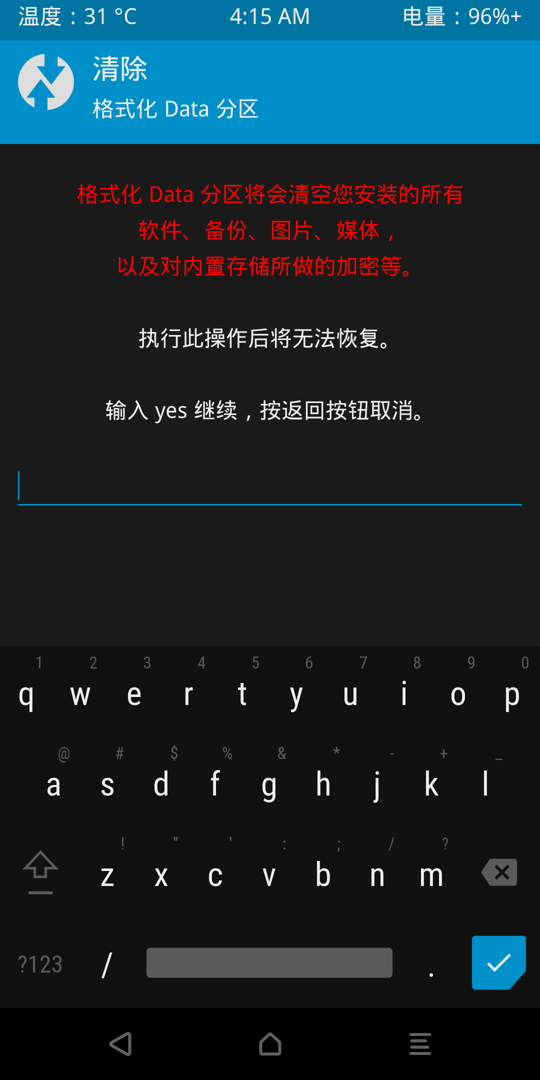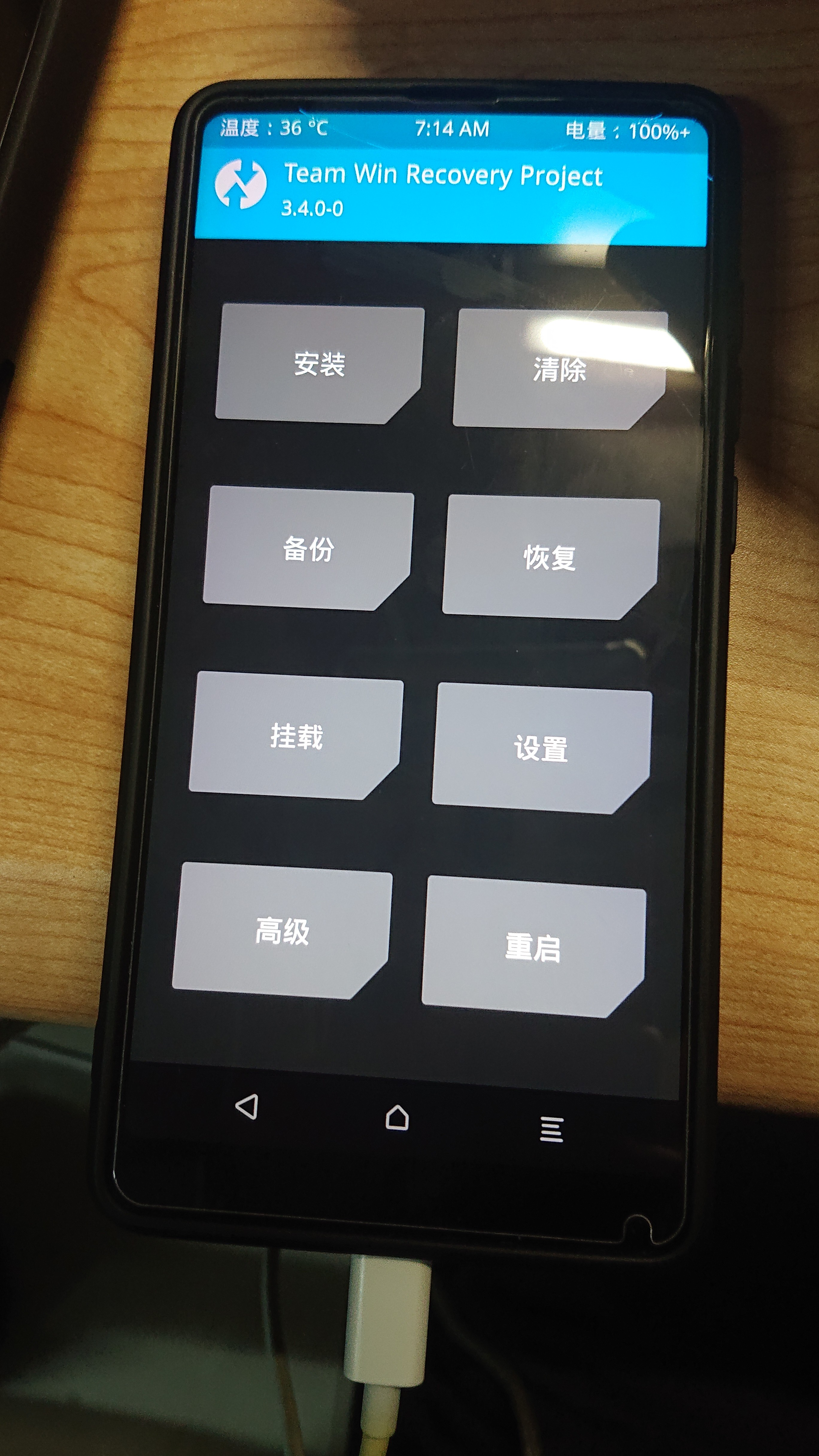 此时,你应该会在一屏等待一段时间后,进入TWRP。进入后说明刷入成功: