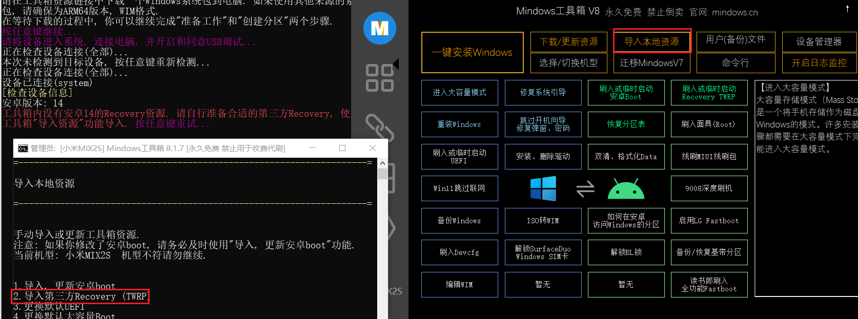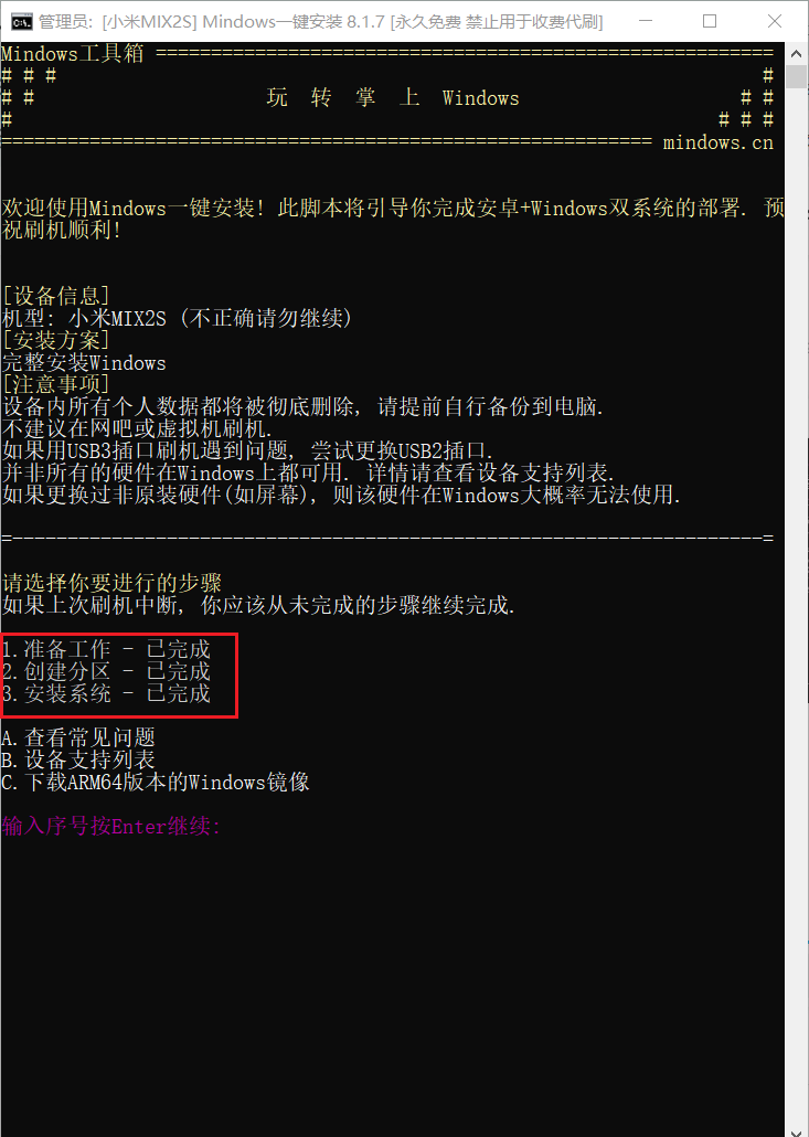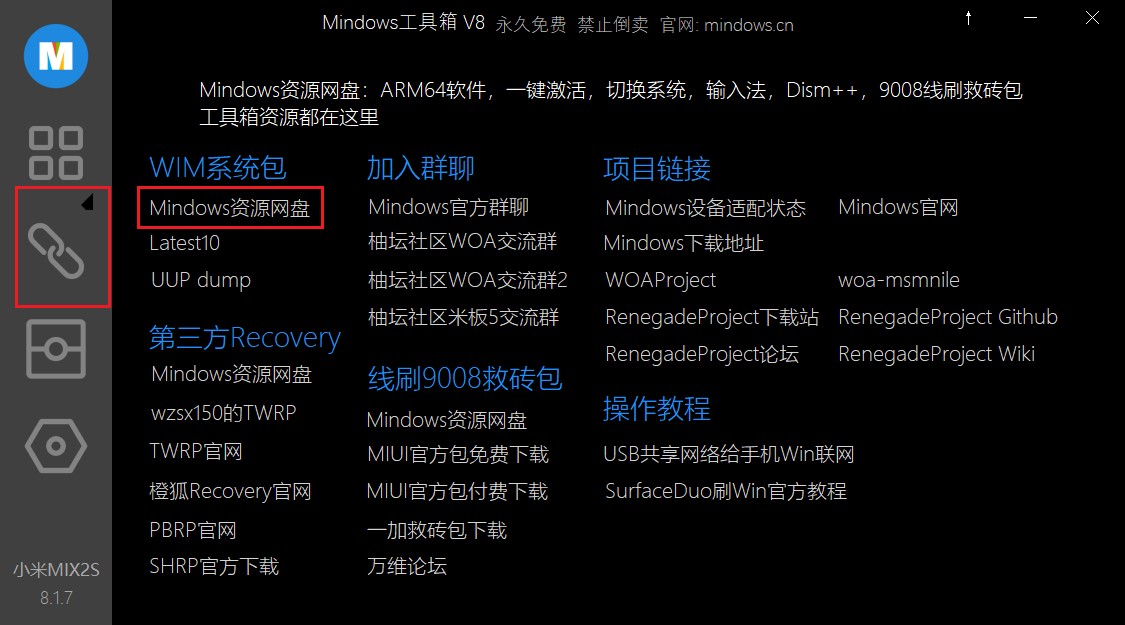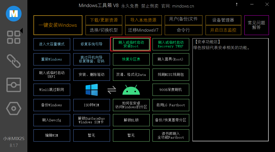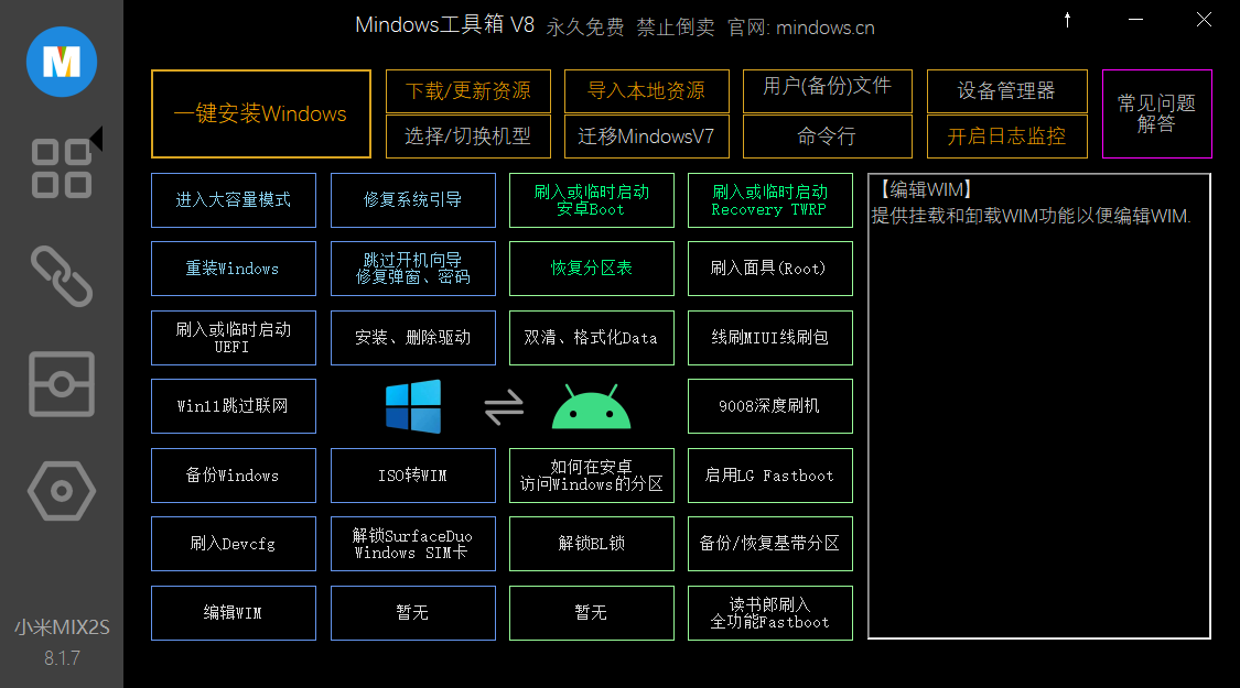 安卓刷windows的主流项目由Mindows工具箱维护,这个工具箱几乎支持了晓龙835和845的所有机型