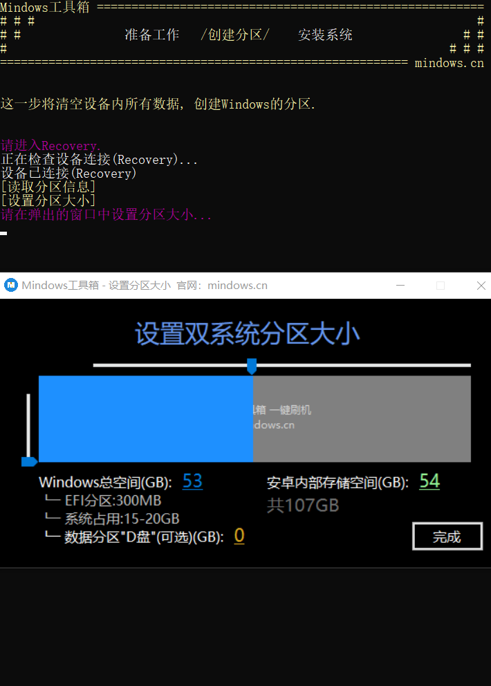 执行一段时间后会进入设置双系统分区大小:这里平分一下大小即可,设置D盘的大小为0