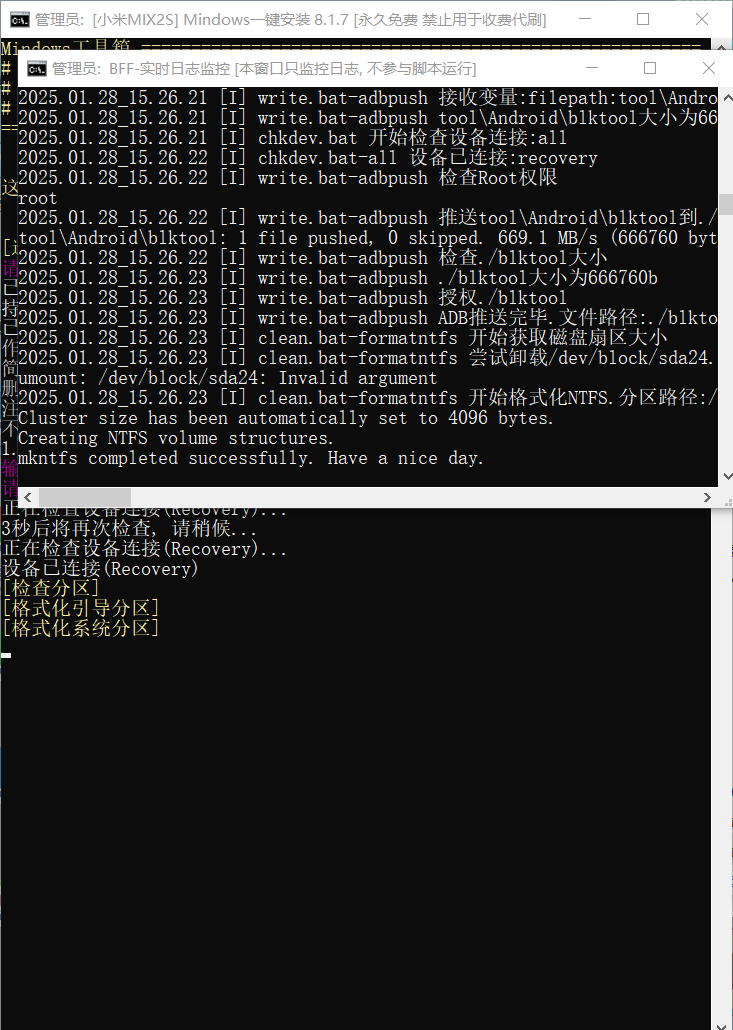 接着我们等待脚本执行:整个过程会自动进行,注意不要操作手机和断开连接线即可