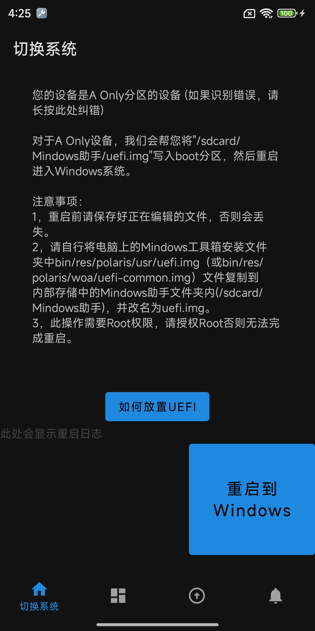 选择重启到windows,测试效果:过程提示root,授权即可: